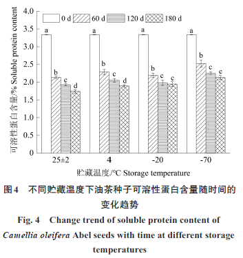 Abstract: To investigate the effects of storage temperature on the quality of Camellia oleifera seeds and reveal the variation patterns of seed vigor indices(malondialdehyde content and relative conductivity)and internal constituent indexes(soluble sugar content,soluble protein content,fat content,and starch content) under different storage temperature conditions,Camellia oleifera seeds were used as test materials.The seeds were naturally air‐dried to a moisture content of 8.36% and then stored at room temperature[(25±2)℃],4℃,−20℃,−70℃,respectively. Seed vigor index and inclusion index were determined at 0,60,120,180 days of storage.The fuzzy mathematics membership function value method was employed for comprehensive evaluation.The results showed that with the extension of storage time,the malondialdehyde content and relative conductivity of Camellia oleifera seeds generally increased gradually under all four temperature conditions,while the contents of soluble sugar,soluble protein and starch showed an overall decreasing trend,and the fat content fluctuated to varying degrees.Compared with 0 day of storage,at 180 days,the seed vigor indexes(malondialdehyde content and relative conductivity)and inclusion indexes(soluble sugar,soluble protein and starch content)were significantly different under the storage condition of(25±2)℃ .Among them,the malondialdehyde content and relative conductivity increased by 199.38% and 104.09%,respectively,while the contents of soluble sugar,soluble protein,and starch decreased by 26.69%,47.95% and 31.00%,respectively.Under the storage condition of −70℃,the changes of each index were not significant(except soluble protein content).The malondialdehyde content and relative conductivity increased by 38.15% and 10.14%,respectively,while the soluble sugar,soluble protein and starch content decreased by 16.78%,36.24% and 6.40%,respectively.Through comprehensive evaluation and analysis,it was found that the quality of Camellia oleifera seeds under four storage temperatures was ranked as follows:−70 ℃>−20 ℃>4 ℃>(25±2)℃.In summary,the low temperature environment(−20 ℃,−70 ℃)was more conducive to maintaining the quality of Camellia oleifera seeds during 180 days of storage,while the storage effect at(25±2)℃ was the worst. Combined with the cost of production practice,it is recommended to select −20 ℃ as the storage temperature of Camellia oleifera seeds.